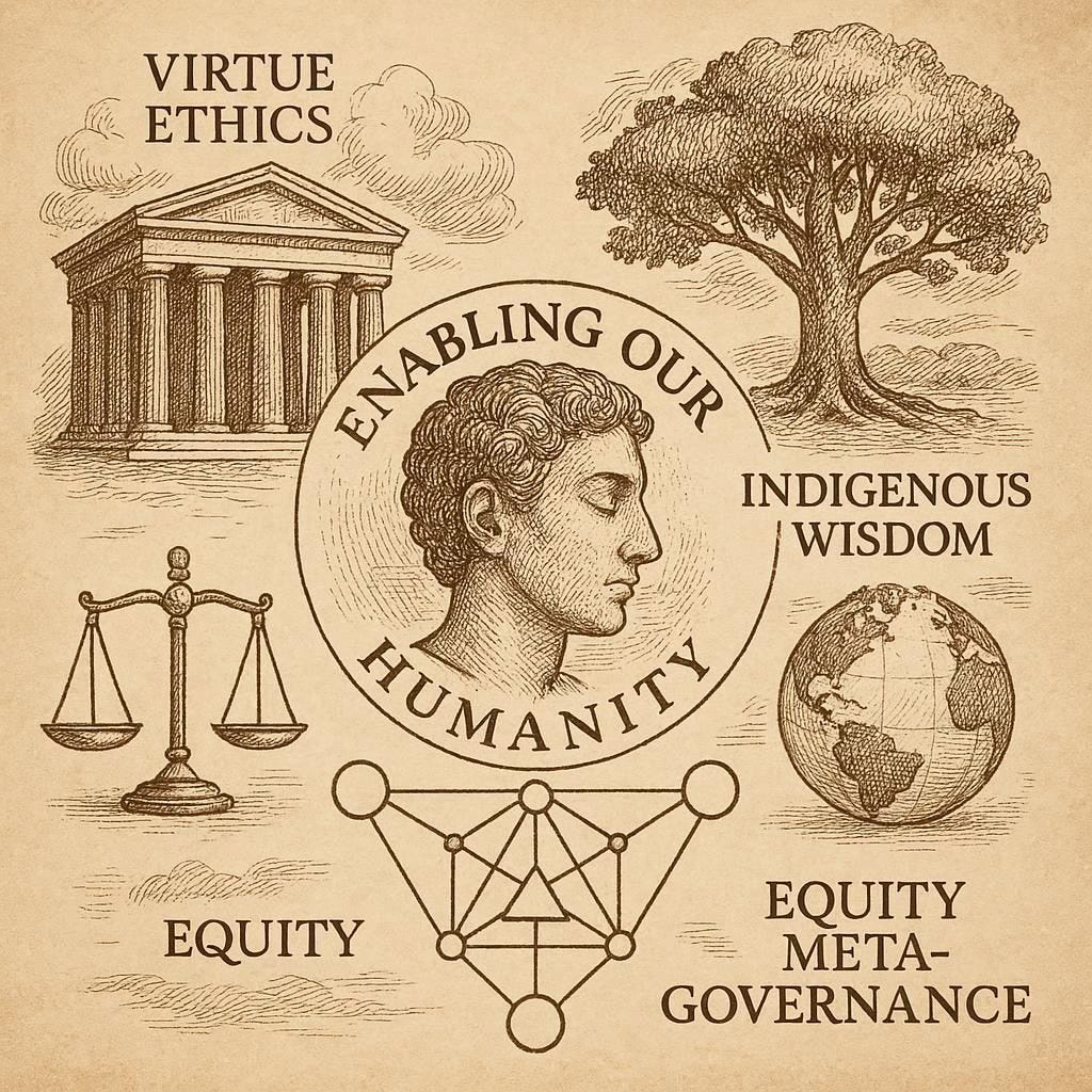 These questions focus our long-term attention on using virtue ethics and indigenous wisdom to cultivate equity meta-governance to create a fair, free, flourishing future, and concurrently solve our self-inflicted wicked problems.