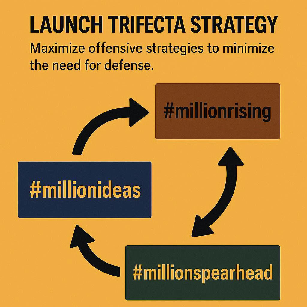 The trifecta strategy is an innovative, comprehensive approach to political entrepreneurship that combines three essential components for making and sustaining transformational change: idea generation (#MillionIdeas), defensive resistance (#MillionRising), and offensive advancement (#MillionSpearhead).