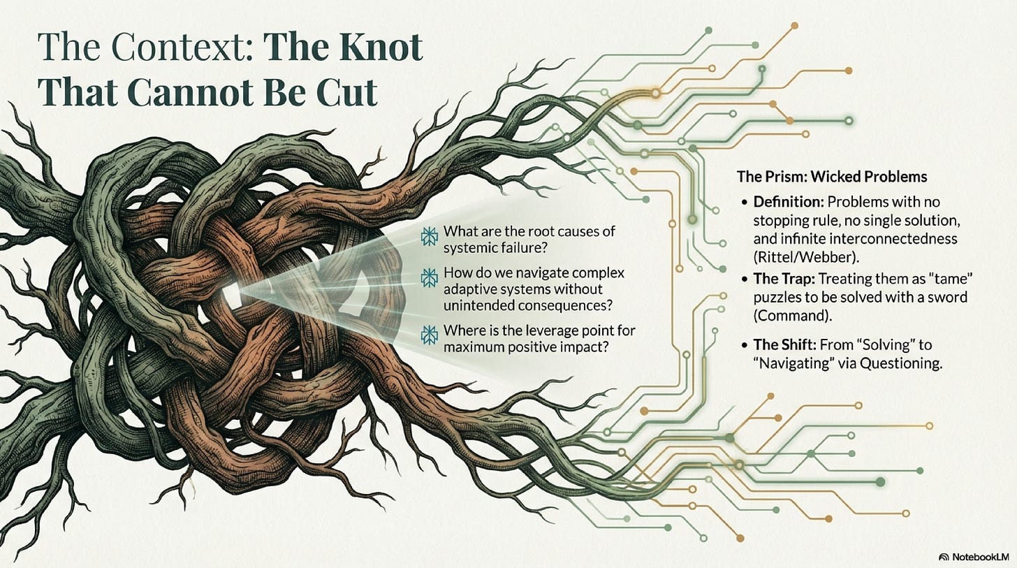 This aphorism is an invitation: slow down, step back, and look at the big picture. We live inside a tangled web of self-inflicted wicked problems: challenges so complex that they have no single solution and no neat right-or-wrong answers.