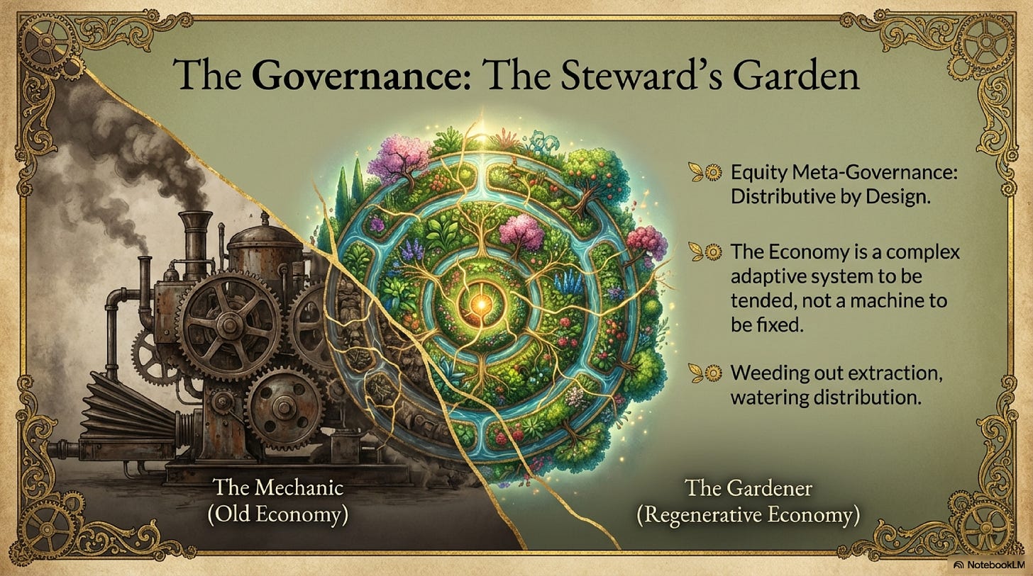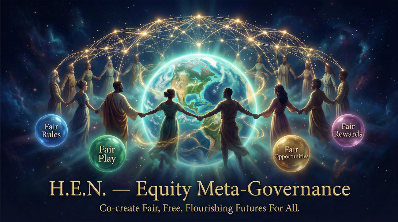 We can use H.E.N. to cultivate equity meta-governance: co-create and negotiate how to develop fair rules, fair play, fair opportunities, and fair rewards for all, on a regenerating planet.