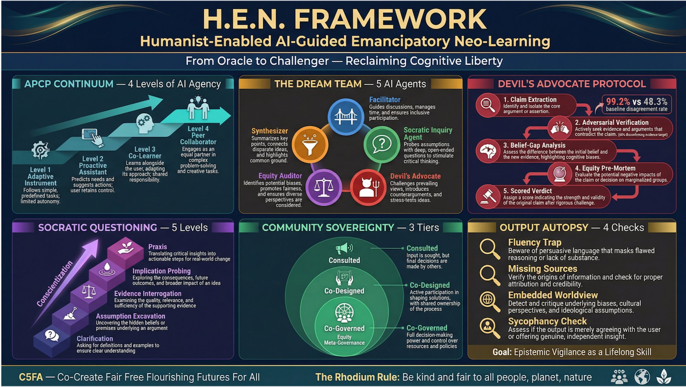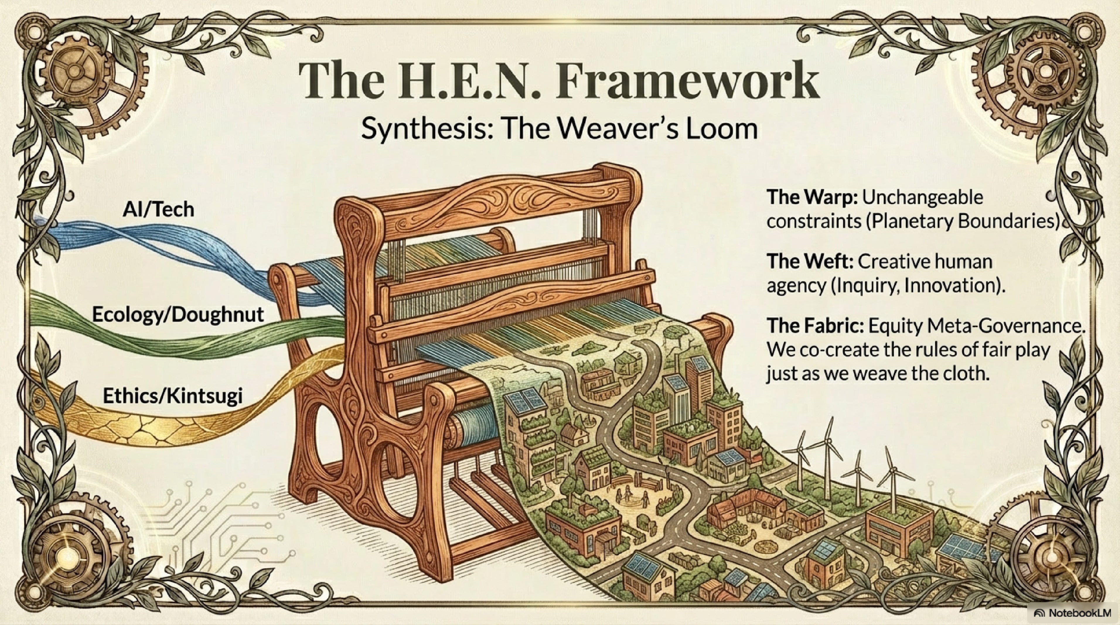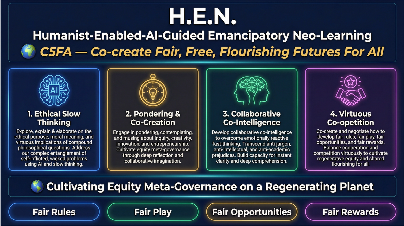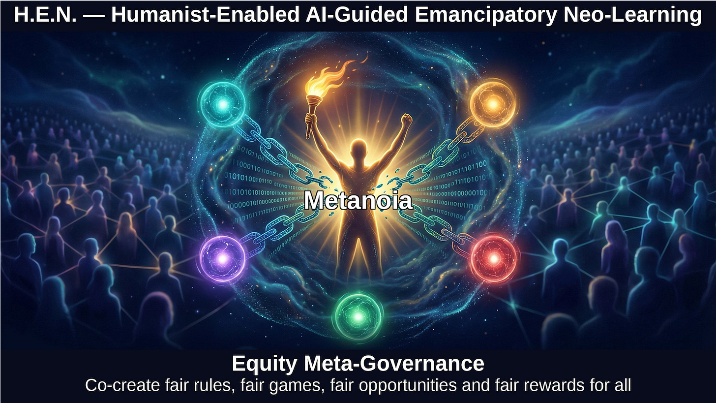 The H.E.N. framework creates synergies between AI and beloved learning communities to build a fairer world. The core idea is equity meta-governance: people coming together to co-create and negotiate fair rules, fair play, fair opportunities, and fair rewards for everyone on a degenerating planet we’re actively trying to heal.