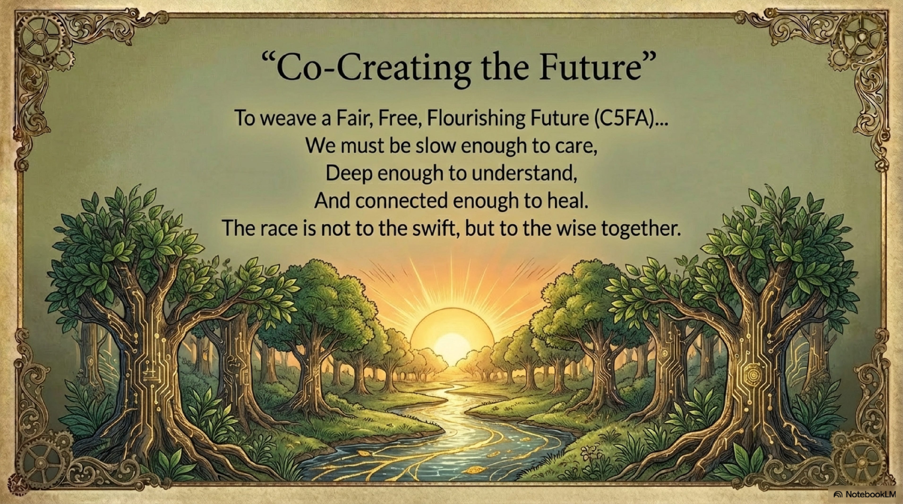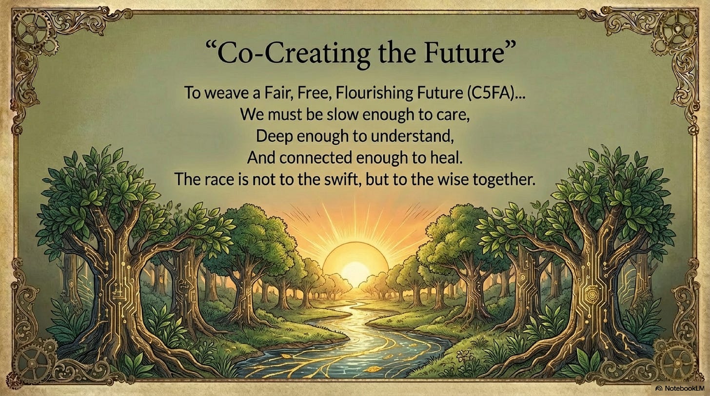Support this inquiry process of cultivating curiosity, open-mindedness, and humility to develop our complexity being-thinking-doing skills needed to Co-create Fair, Free, Flourishing Futures For All (#C5FA).