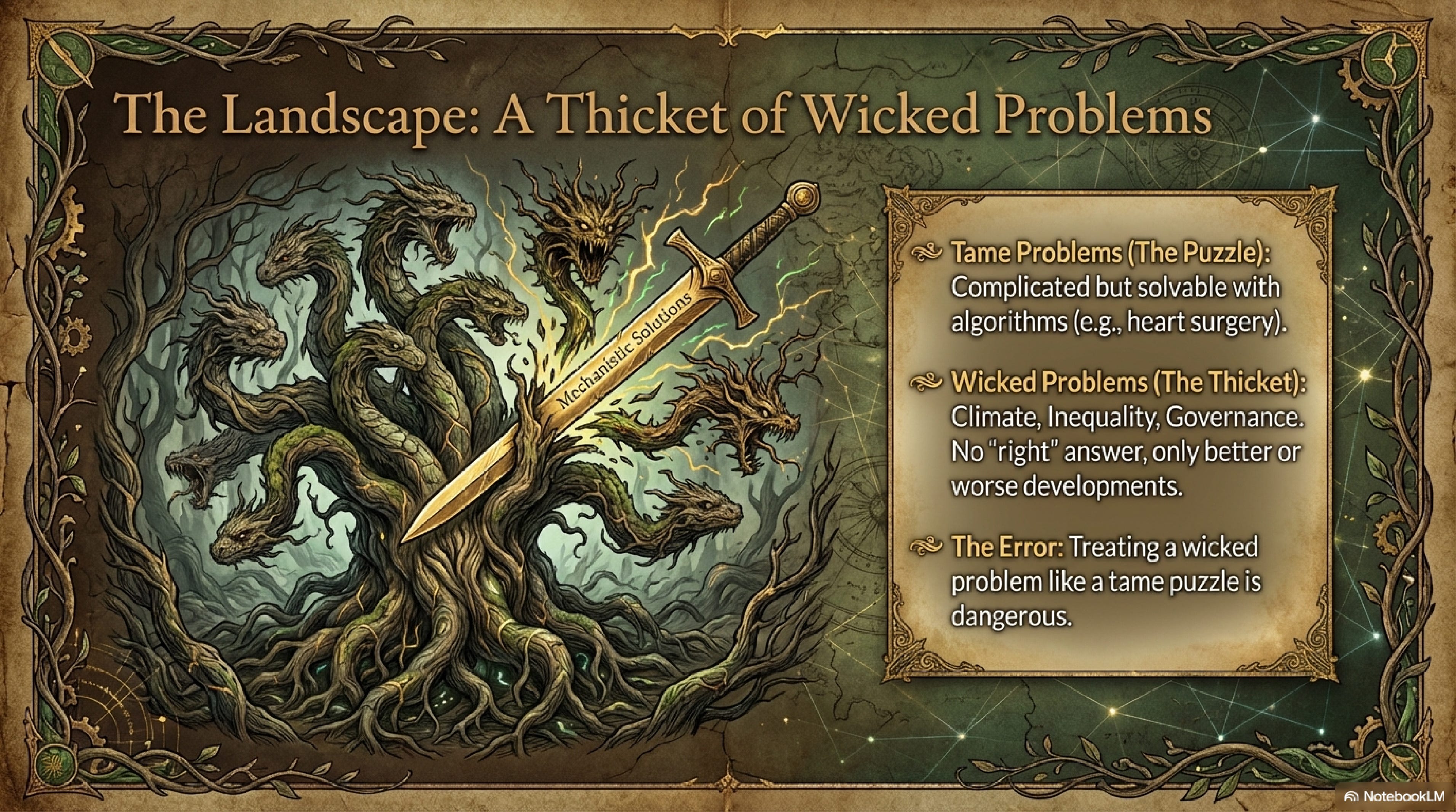 Wicked problems are different. They’re messy, interconnected, and shape-shifting. The real danger, what we might call the original sin of reductionism, is when we react emotionally and zoom in on one piece of the puzzle while ignoring how everything is connected. To see wicked problems clearly, we need to zoom out with calm, steady attention and hold the whole picture in view.